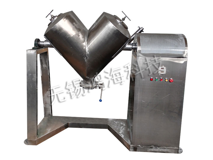 本設備利用混合機二圓柱筒長度不相等,形成不對稱,當混合機轉動時物料從分解到組合,從組合到分解,由于物料平面不同,也有橫向力,又推動物料進行橫向交流,每轉動一圈橫向力約使25%的物料從一個桶流向另一個桶,這樣物料橫向徑向混合,分解組合相互進行,使物料達到非常均勻的混合效果。
